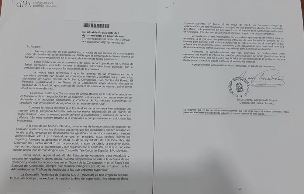 El Defensor del Pueblo Andaluz, se hace eco de la problemática que sufre nuestro pueblo y la Comarca Sierra Morena de Sevilla con las interrupciones en los servicios de internet y suministro eléctrico. Esta entidad procede a abrir de OFICIO "LA QUEJA" que se adjunta a esta noticia.