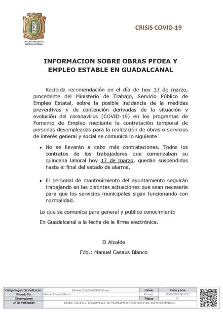 INFORMACIÓN SOBRE OBRAS PFOEA Y EMPLEO ESTABLE EN GUADALCANAL.