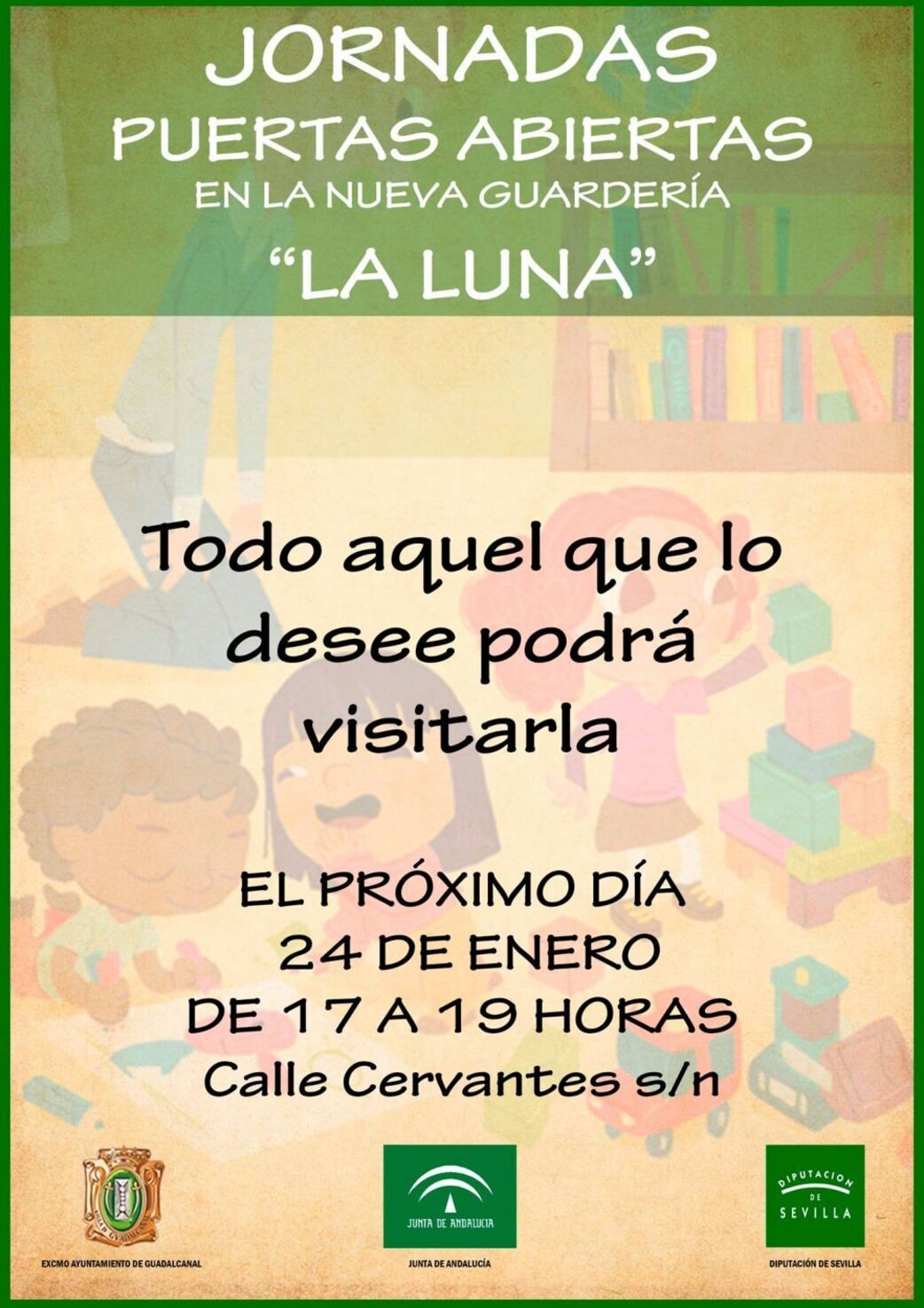 El próximo martes 24 de enero, de 17:00 a 19:00 horas, se llevará a cabo una Jornada de Puertas Abiertas, para toda aquella persona que quiera conocer las nuevas instalaciones de la Guardería "La luna". La nueva guardería está situada en Calle Cervantes, junto a la Unidad de Servicios Sociales de la localidad.