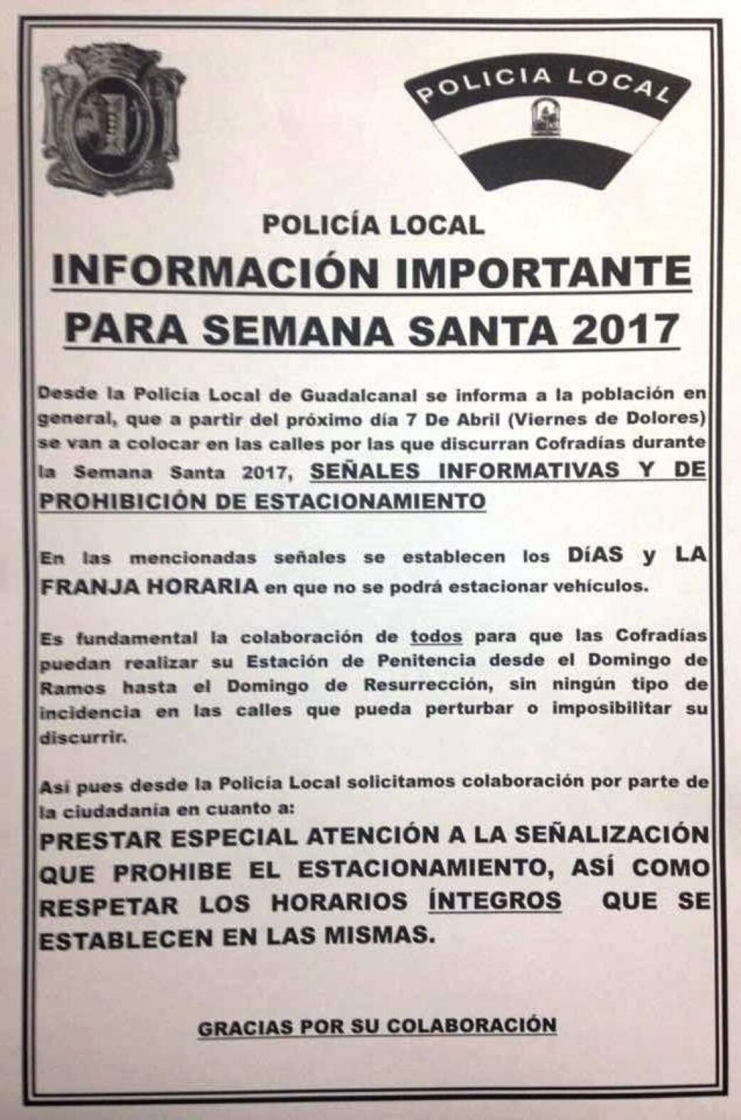 POLICÍA LOCAL. INFORMACIÓN IMPORTANTE PARA SEMANA SANTA 2017